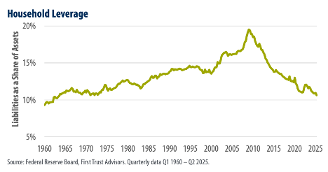 - Household Net Worth – Truly – this has never been better. There are three very interesting charts from this report. My favorite is the “Household Leverage” chart, shown below. But do not miss the chart showing US Net Worth compared to Liabilities.