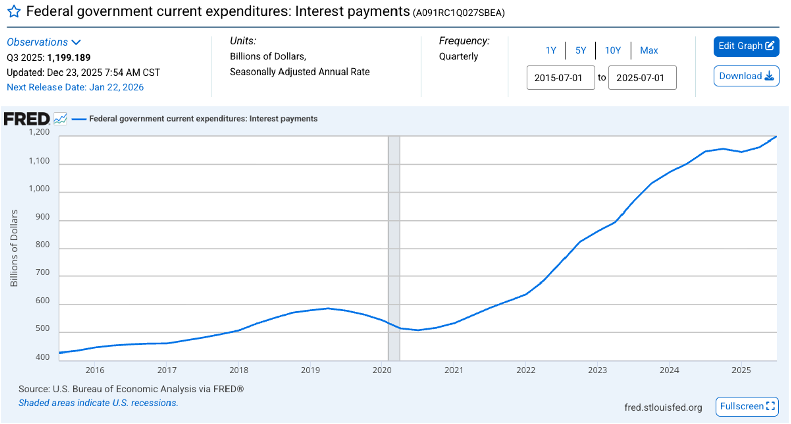 Debt Interest Payments – Most in this country would agree that the Federal Debt is just too high, but did you realize that the interest payments on this debt is just under 1.2 trillion a year? This continues to go the wrong direction. What should we do about it? My guess is we should balance the government budget…. But no one is asking me. What’s more, there’s about 3 Trillion in debt to be reissued in 2025 and the broad assumption is that the new interest rates will be quite a bit higher on the reissued debt. So what will this mean? It’ll likely mean even a greater about of debt interest payments.