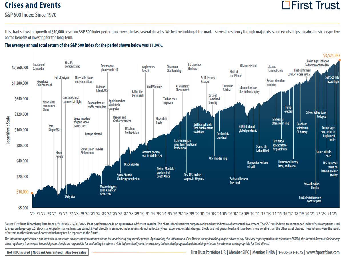 The math of resilience is staggering: A $100,000 investment in the S&P 500 in January 1973, at the very start of a decade of stagflation, oil shocks, and political crisis, would have grown to over $24.7 million by the end of 2025 (source). That is a compound annual growth rate of 10.9% through 53 years of uncertainty.