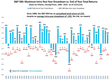 Volatility is the temporary decline in your account balance during a market correction, like the 21% drop we saw during the Tariff Typhoon of 2025. Volatility is uncomfortable, but it is not a loss unless you sell. It is simply what some call the "price of admission" the market charges for long-term returns.